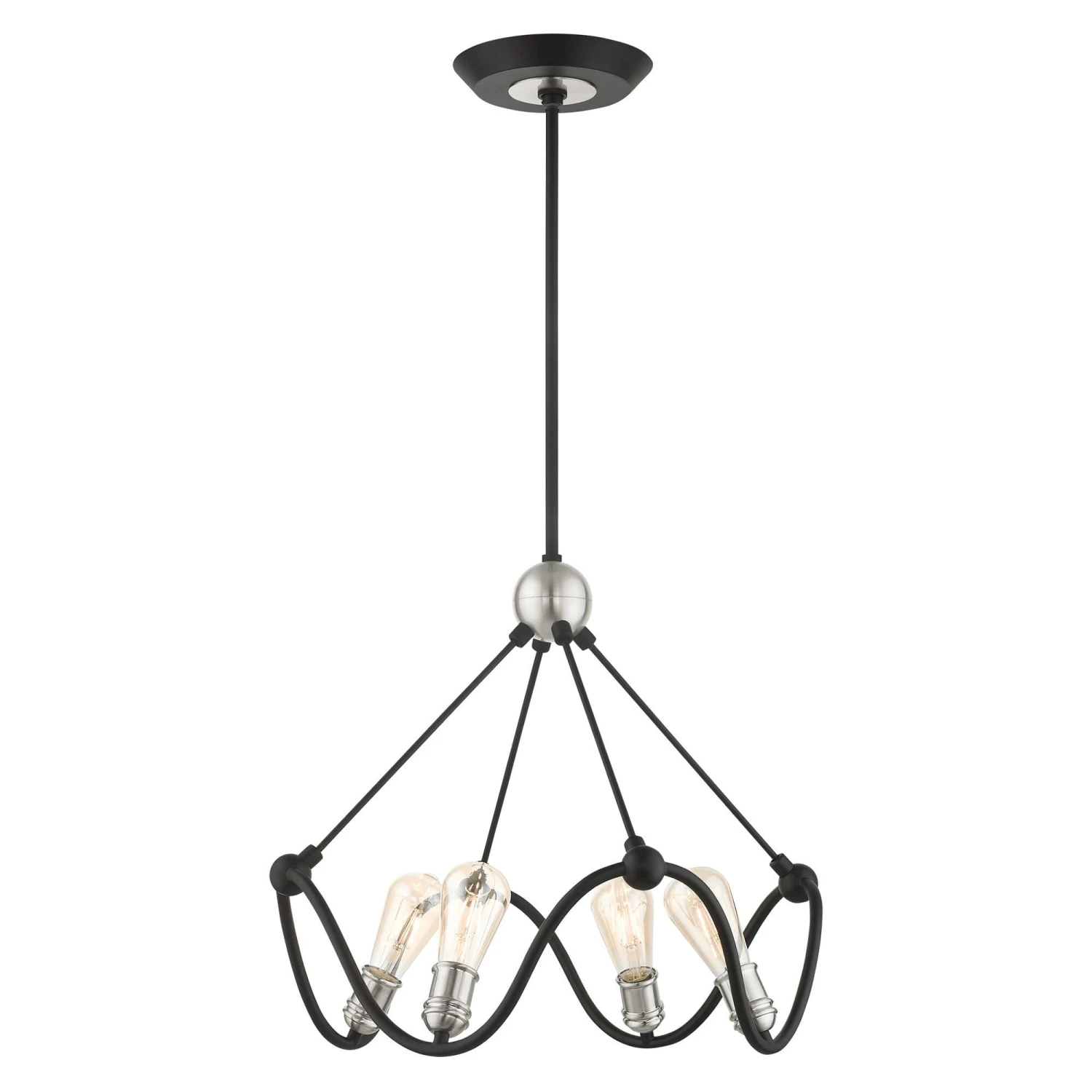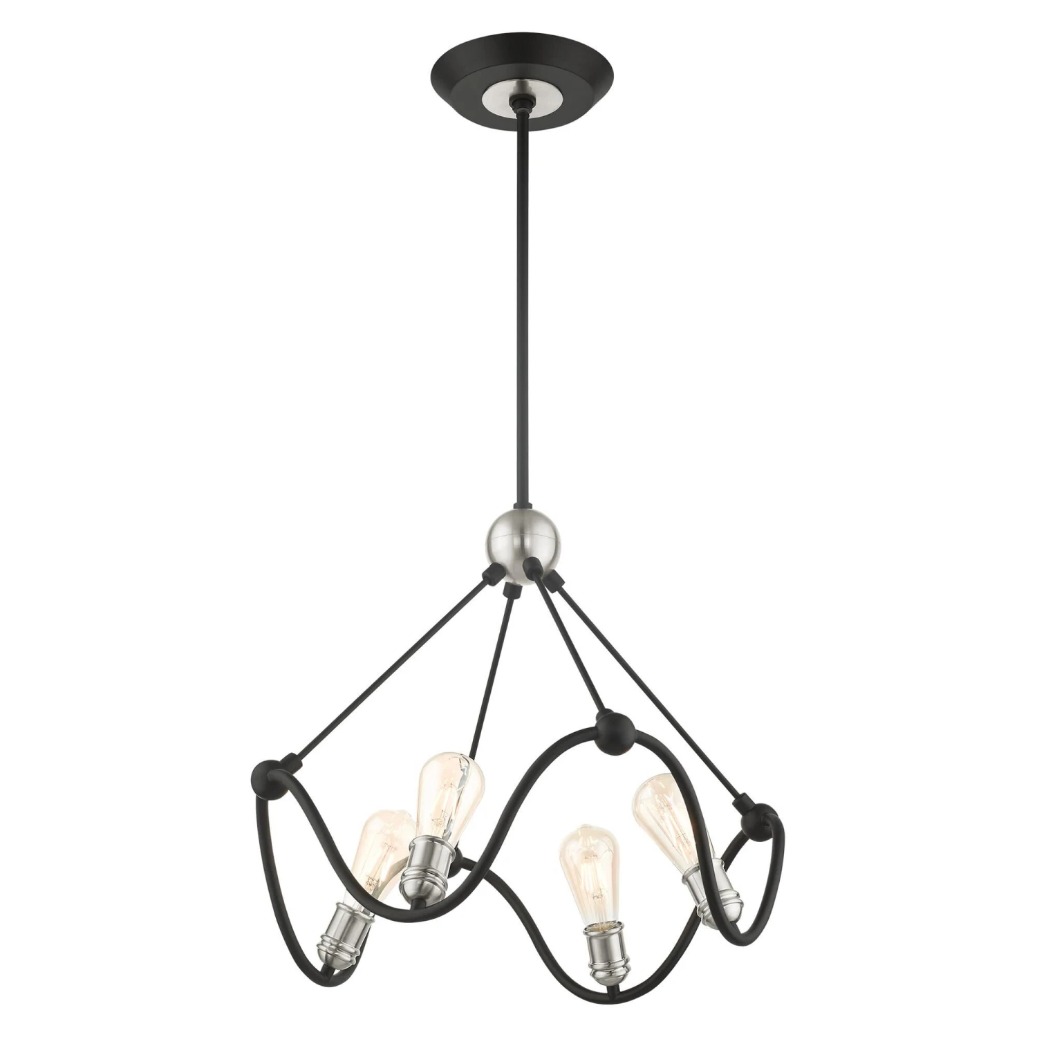 Get into the heart of the matter with the Archer collection. Industrial, urban and stylish, its graphic lines will emphasize the airy flow of a contemporary loft interior. The wrought iron is finished in black and is combined with brushed nickel accents. It pairs perfectly with Edison style type bulbs. This dramatic four light chandelier will float weightlessly over a living room, kitchen, bedroom or reclaimed wood dining table. It will also work in any contemporary or transitional setting.