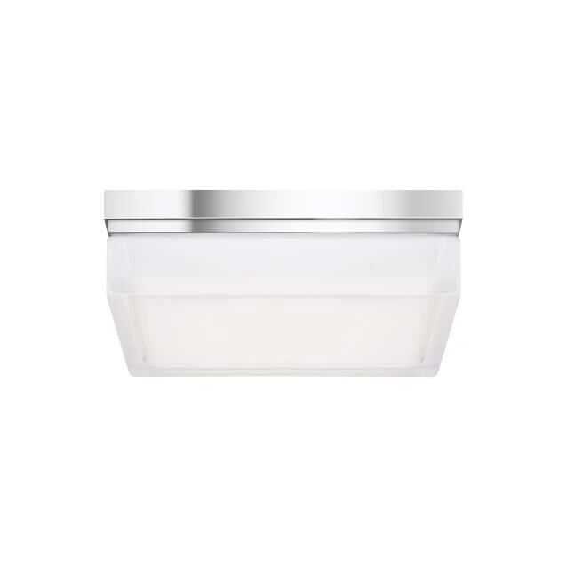 Clean square pressed glass shade with polished surface suspended from a die-cast base.
