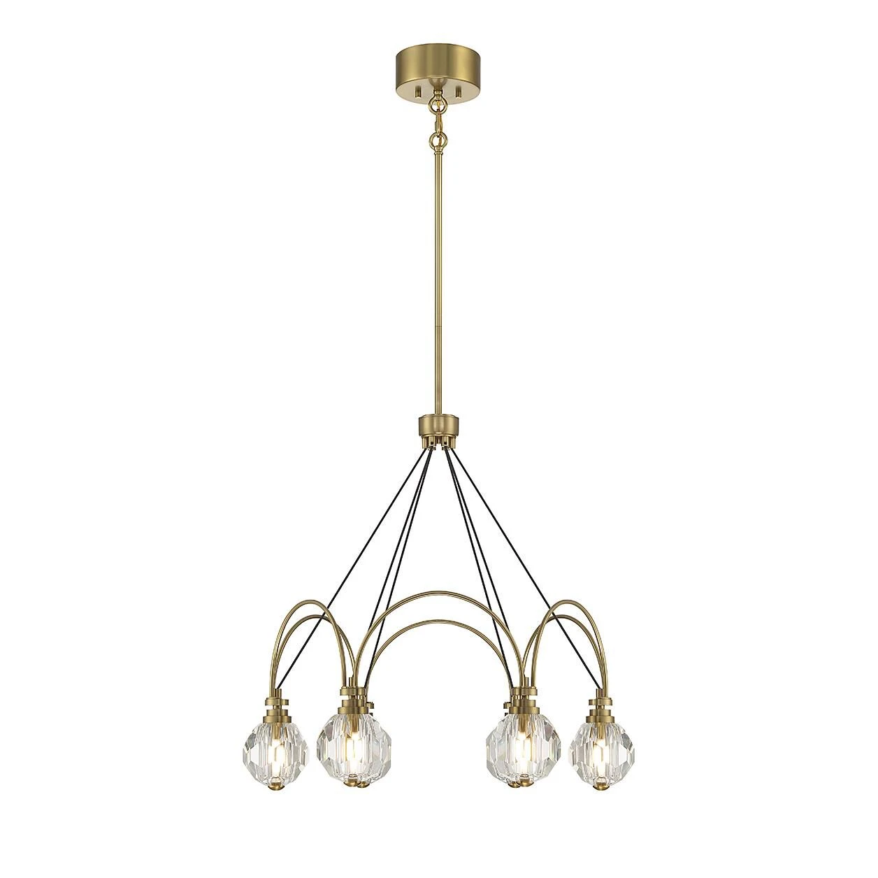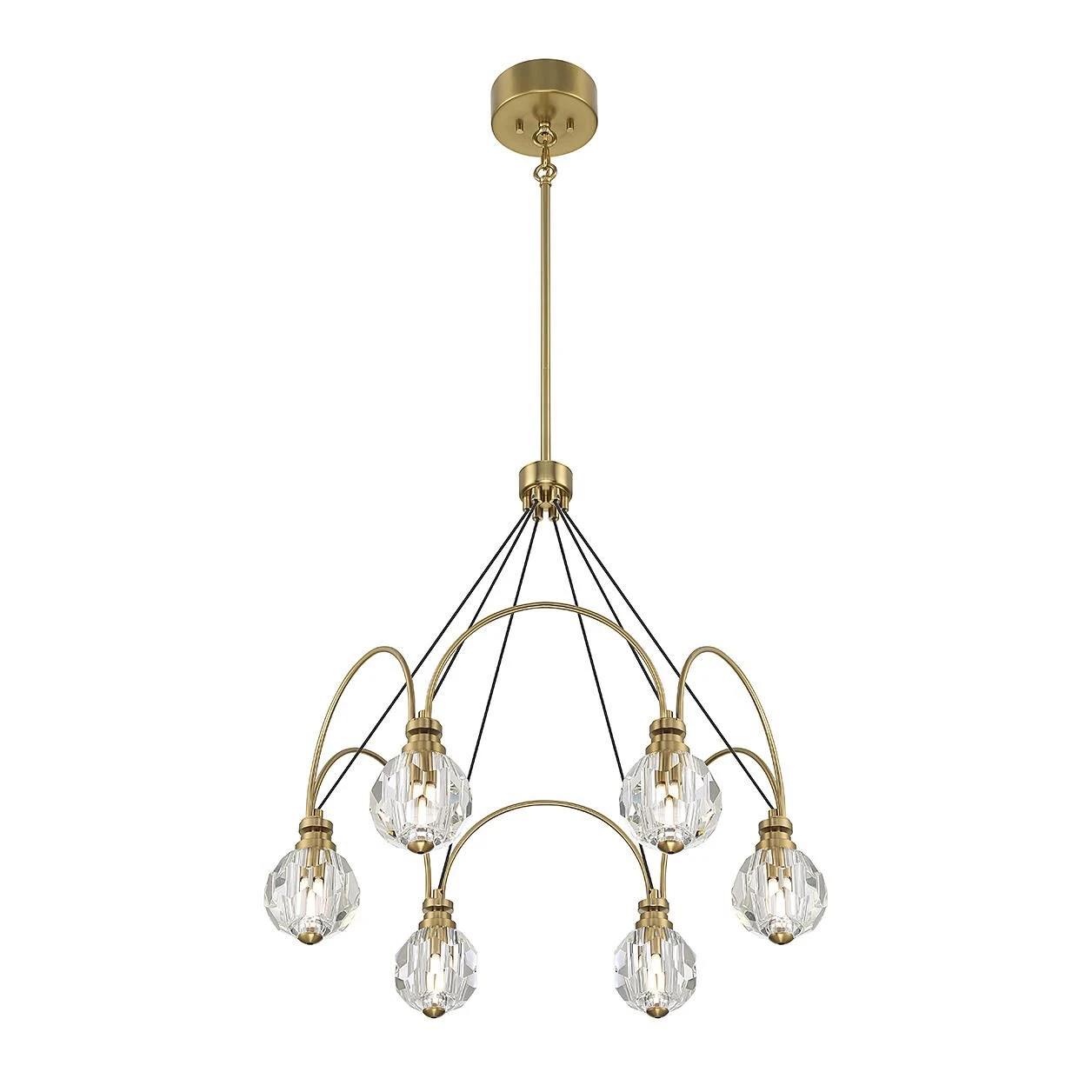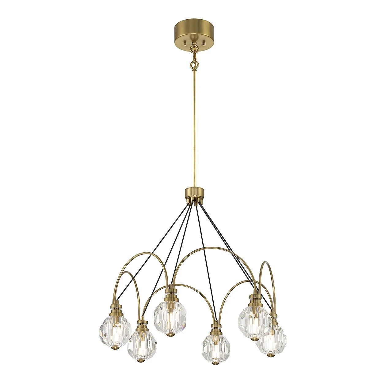 Create a dramatic, Art Deco-inspired centerpiece with the showstopping Savoy House Burnham 6-light chandelier! Each curving arm is topped with an ornament of highly faceted clear crystal that encases the light bulb. The warm brass finish pairs nicely with the black cords that support the arms. Burnham is 26″ in width and has an adjustable height ranging from 24.75″ to 78.75″. Comes with four 12″ downrods and one 6″ downrod. G9 LED bulbs are included.