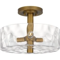 The Calpella semi-flush mount offers a painterly effect in a foyer or bathroom. The clear hammered glass shade recalls a softly rippled pond. An aged brass finish completes this serene, stylish look.