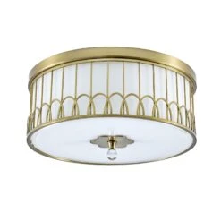 A scalloped motif surrounds the drum silhouette of this antique brass-finished iron flush mount. An enclosed opal glass shade creates a soft glow, and the design is punctuated by a finial in clear crystal.