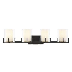 The Savoy House Eaton 4-light bath vanity light has an elegant and appealing look with shades of clear and white opal glass, jewelry-like prong detailing and a two-tone finish of black and brass. Create the illusion and beauty of candlelight with Eaton! This bath light is 7.5″ in height, 33″ in width and extends 7.5″ from the wall. Uses four standard size bulbs of up to 60 watts per bulb. Damp area rated.