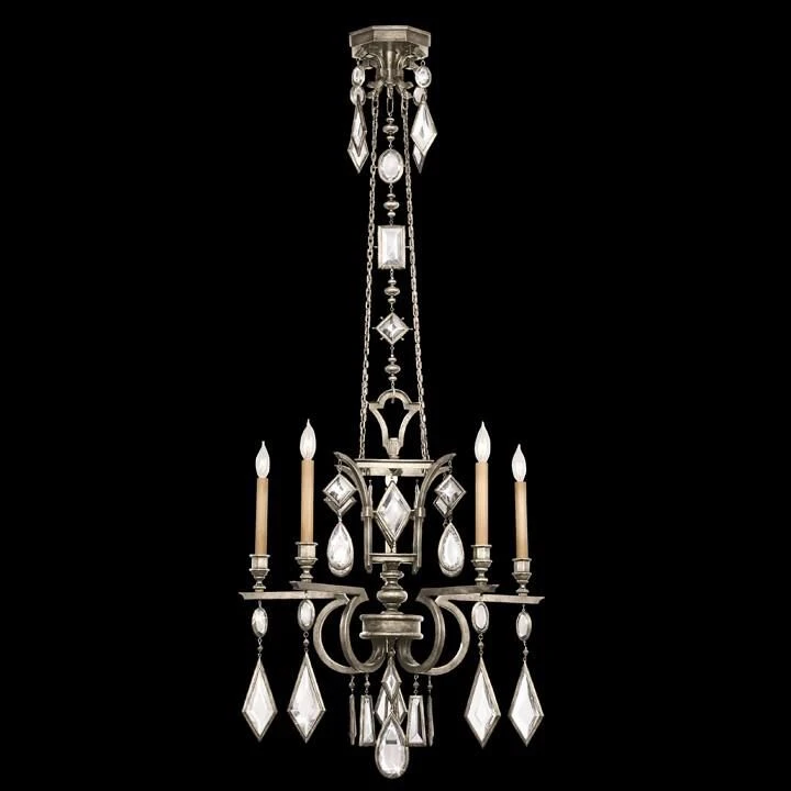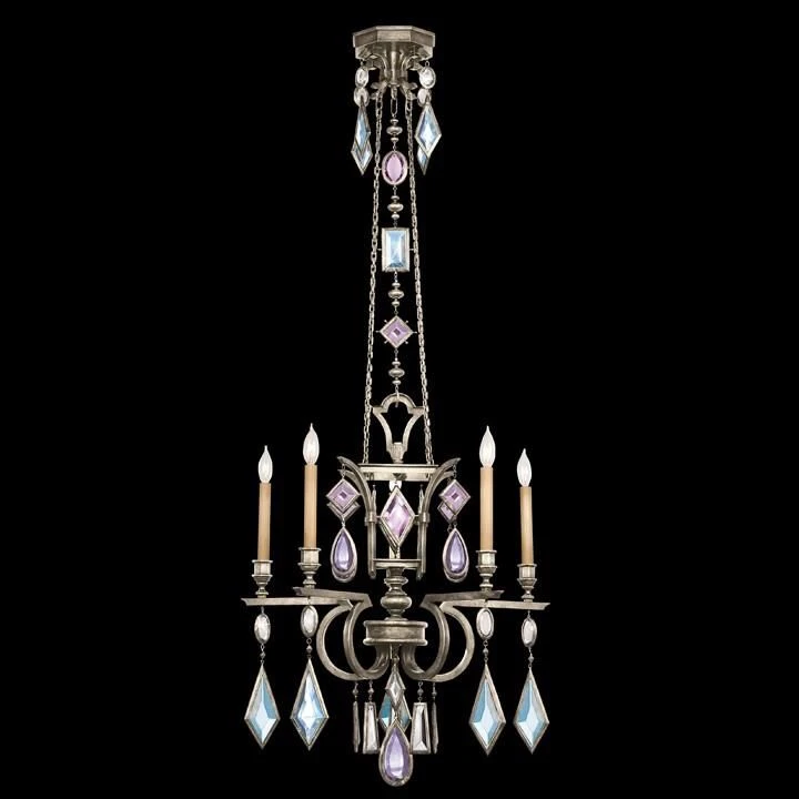 Chandelier in vintage silver leaf finish with multi-colored crystal gems of amethyst, tourmaline, and aquamarine colors. Includes 2 decorative chain for height adjustment.