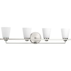 The four-light Flight bath and vanity features a variety of industrial modern elements, including a linear frame and circular wall plate. The geometric and linear design is complemented by glass shades and finish. Fixture can be installed with glass facing up or down.
