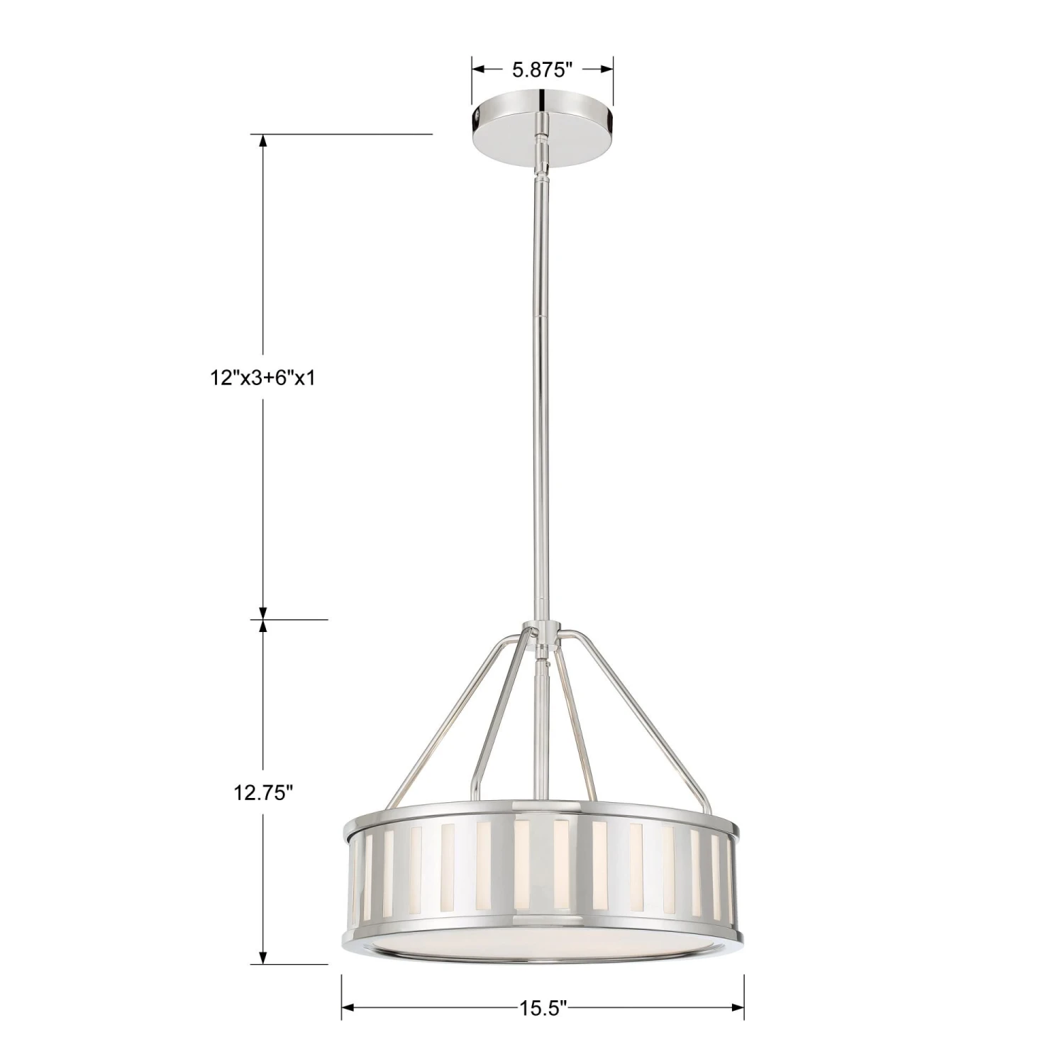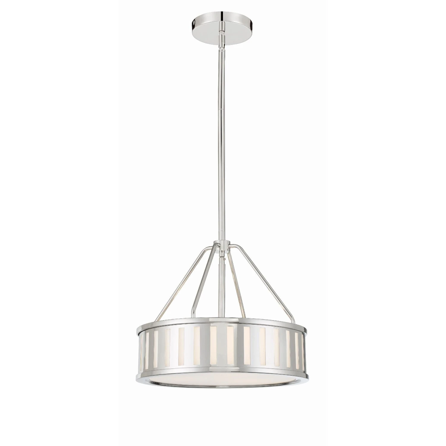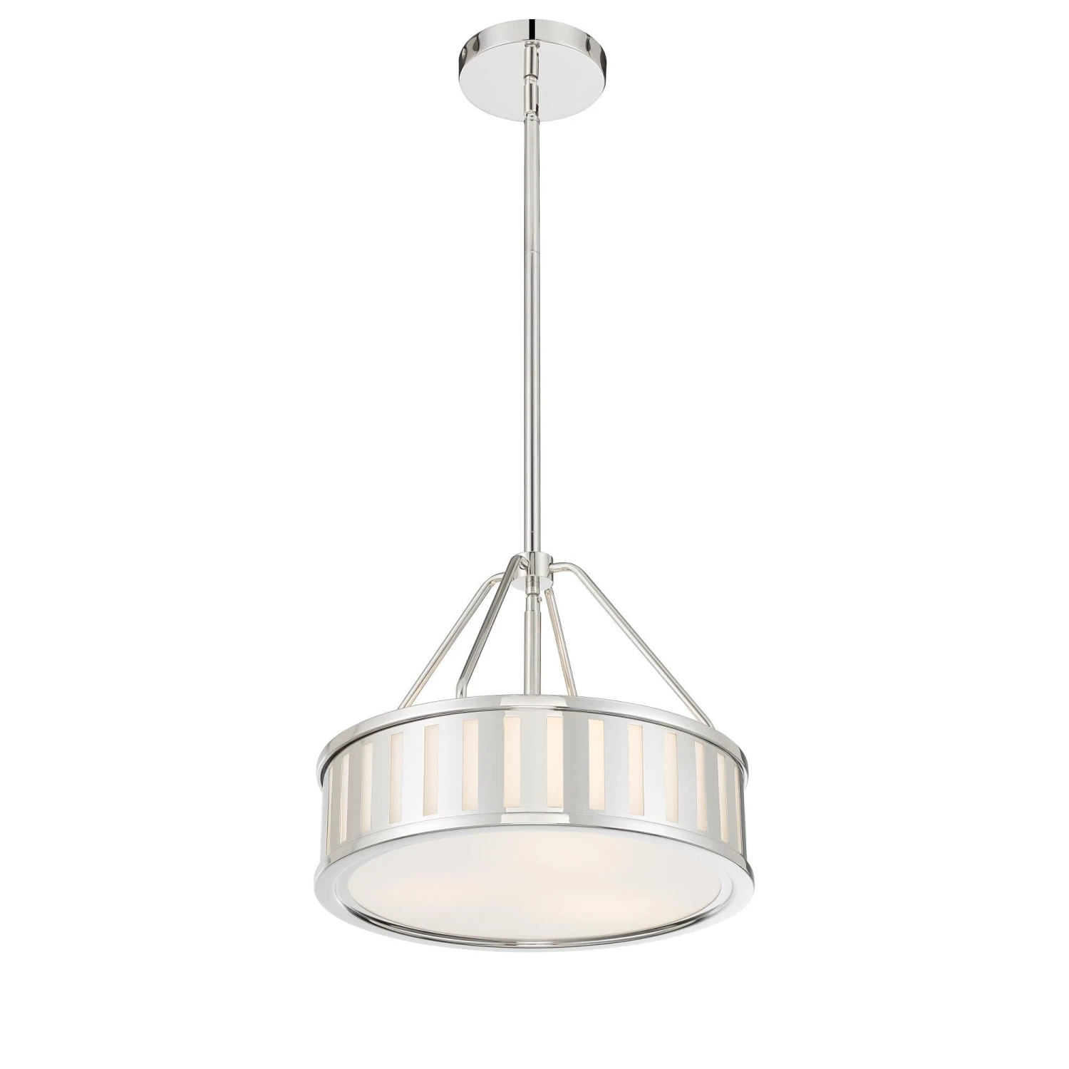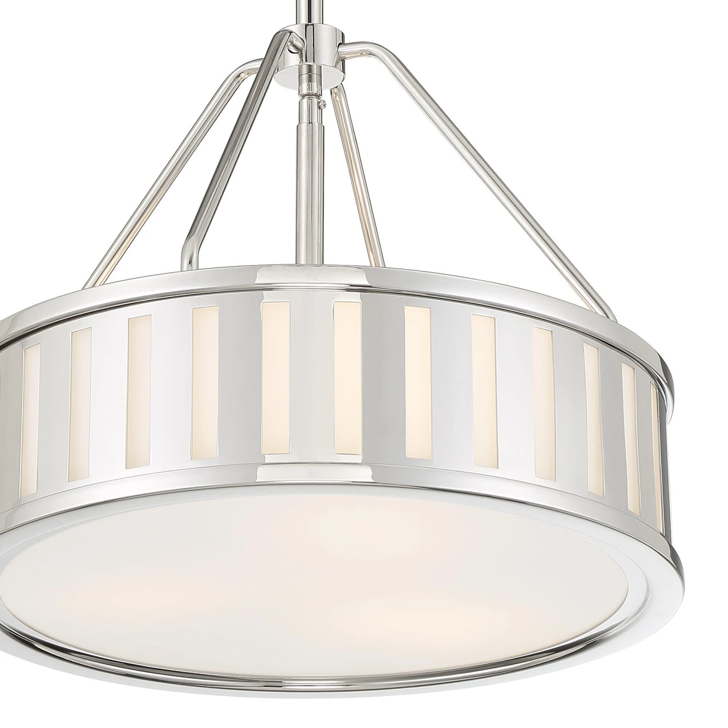 The contemporary Kendal collection makes a statement with its graphic uniform pattern. Its metal frame surrounds white glass in this elegant drum-shaped pendant. The high contrast of matte gold or polished nickel against white glass is a great way to add a touch of drama to a room.