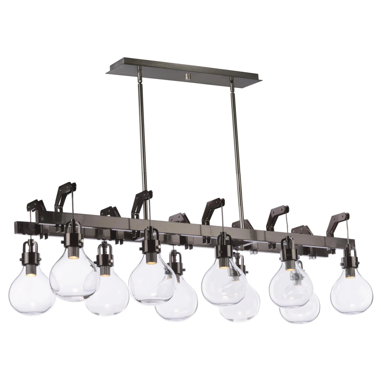 Contemporary Industrial design is met with the Kinetic series transforming mechanical parts into beautiful metal components finished in Dark Satin Nickel. Wire cord is run along a truss like structure separated by transformer-like castings. Large Clear glass globes are suspended from brackets with recessed LED illumination coming from decorative heat sinks.