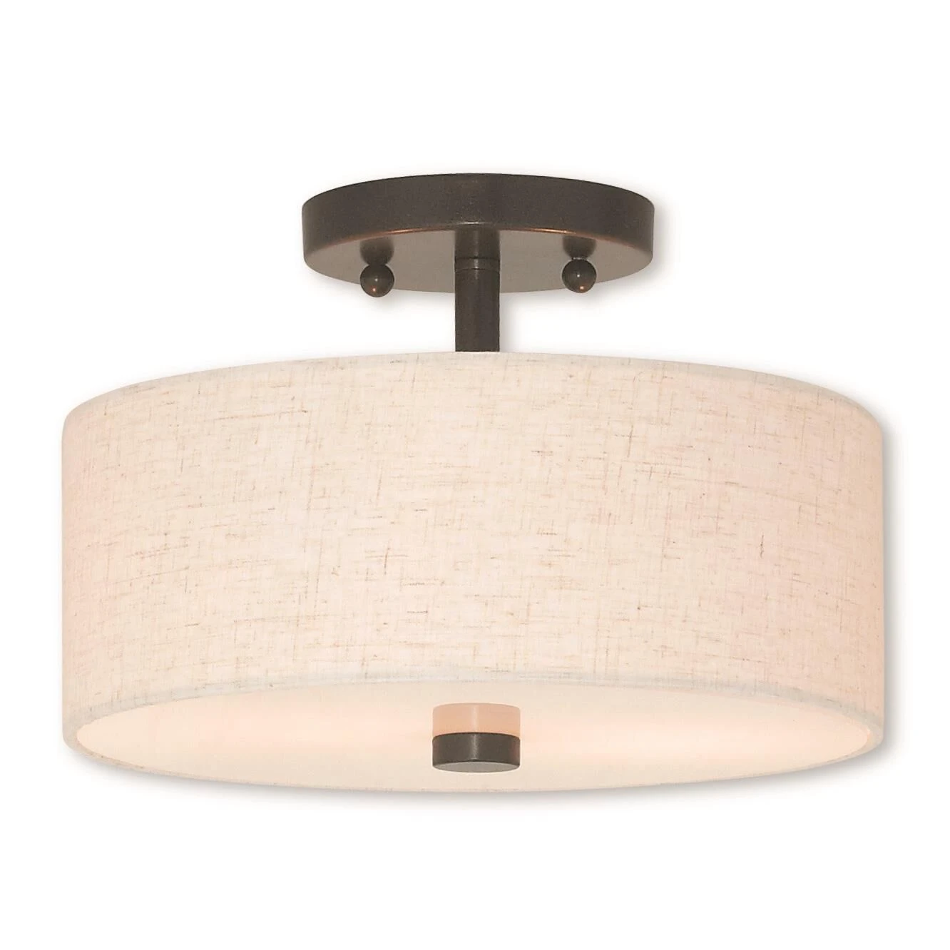 Add style to any room with this elegant semi flush mount. The design features a beautiful hand crafted oatmeal fabric hardback drum shade in a stylish english bronze.