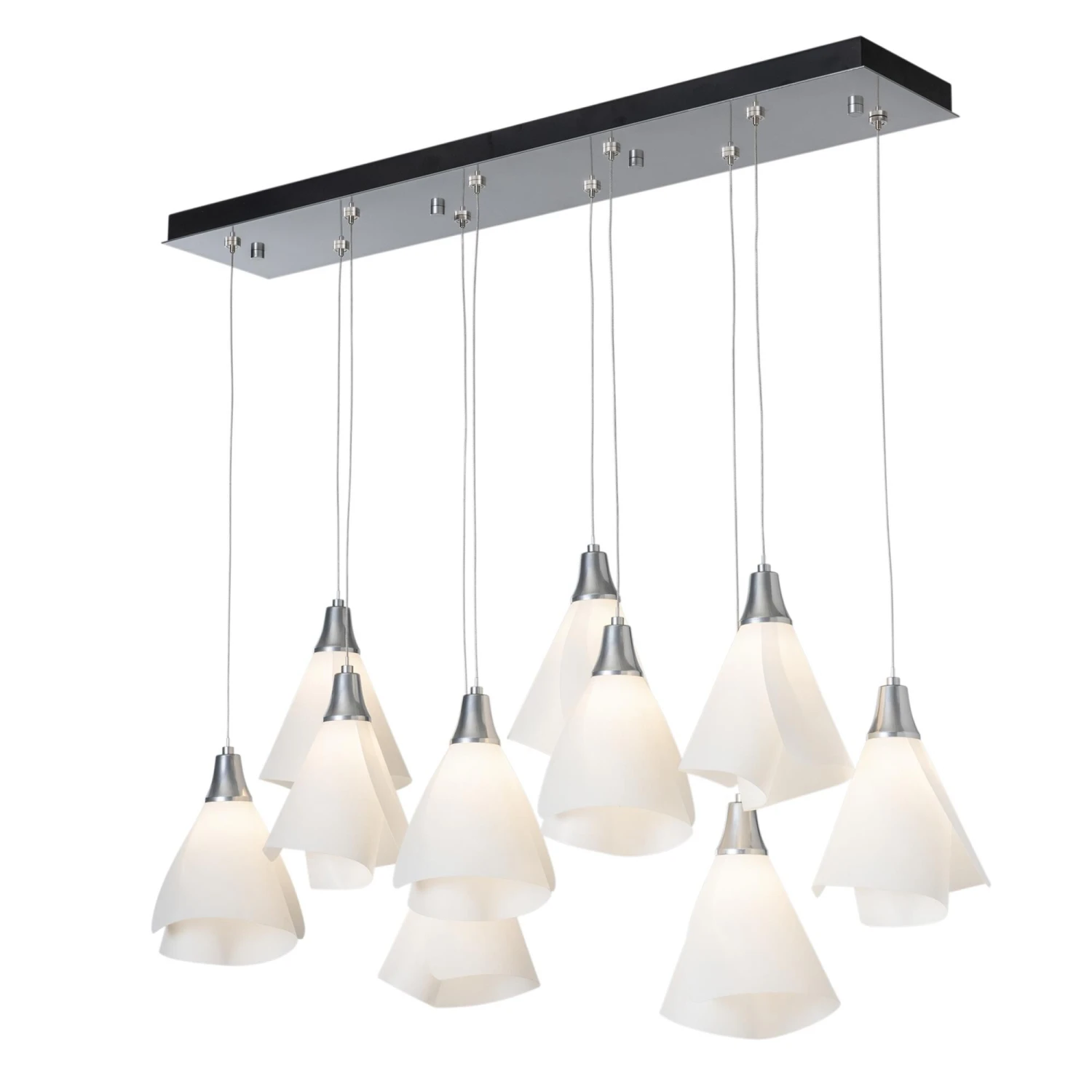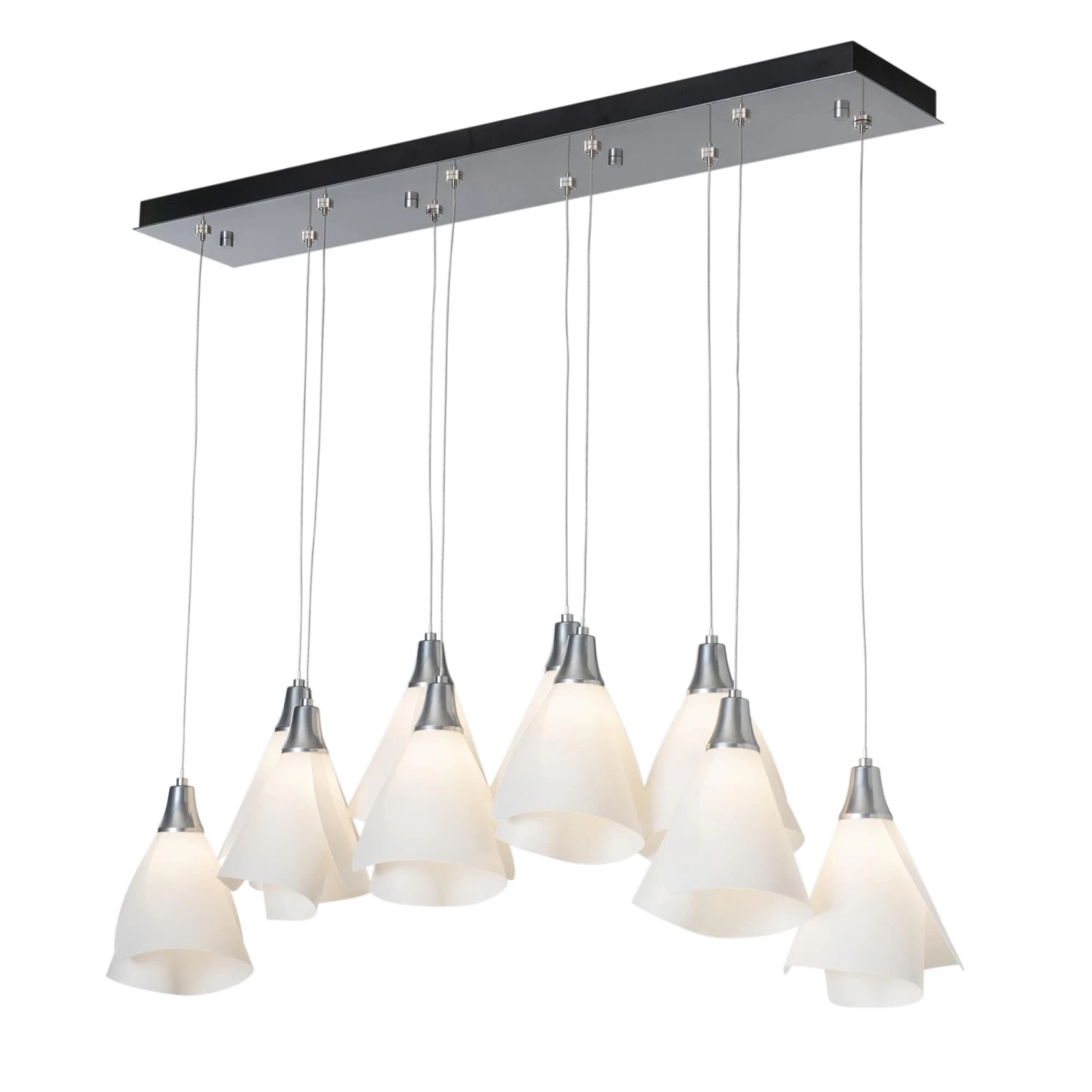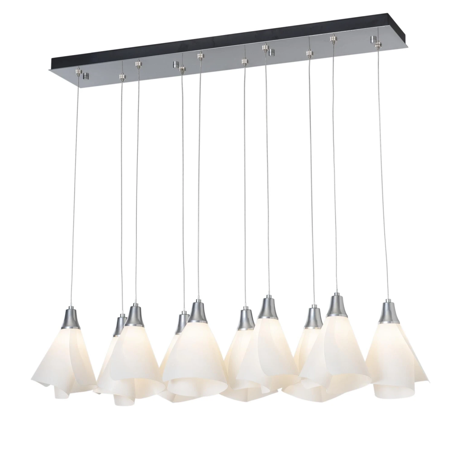 Graceful Mobius spun-frost shades seem to float in space from the rectangular canopy above. With the ability to customize each shade’s positioning, whether you prefer the 10 lights to be aligned or staggered heights, the Mobius 10-Light fixture features a double linear multi-port. All Hubbardton Forge products are hand-crafted to last one at a time in Vermont and backed by a Lifetime Limited Warranty.