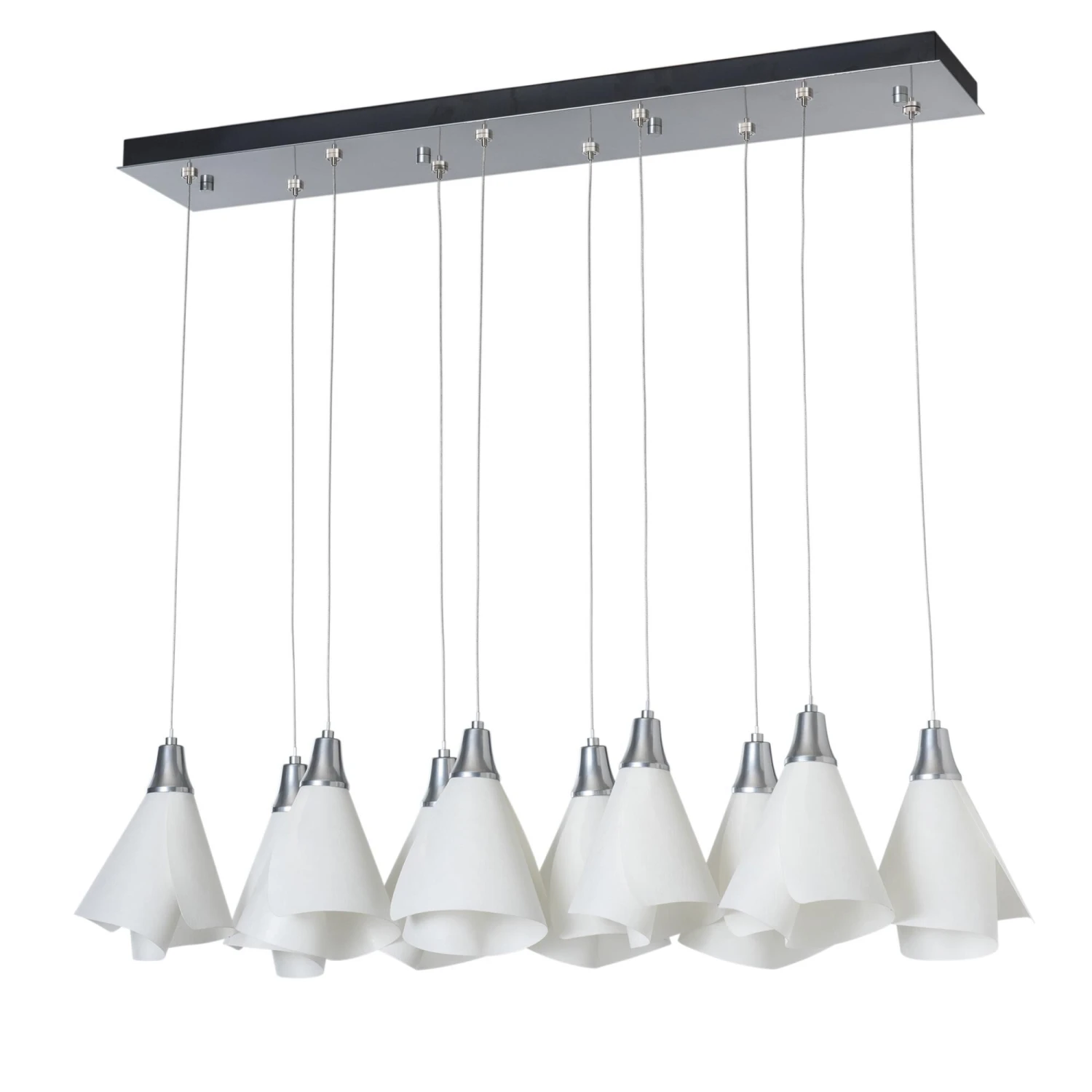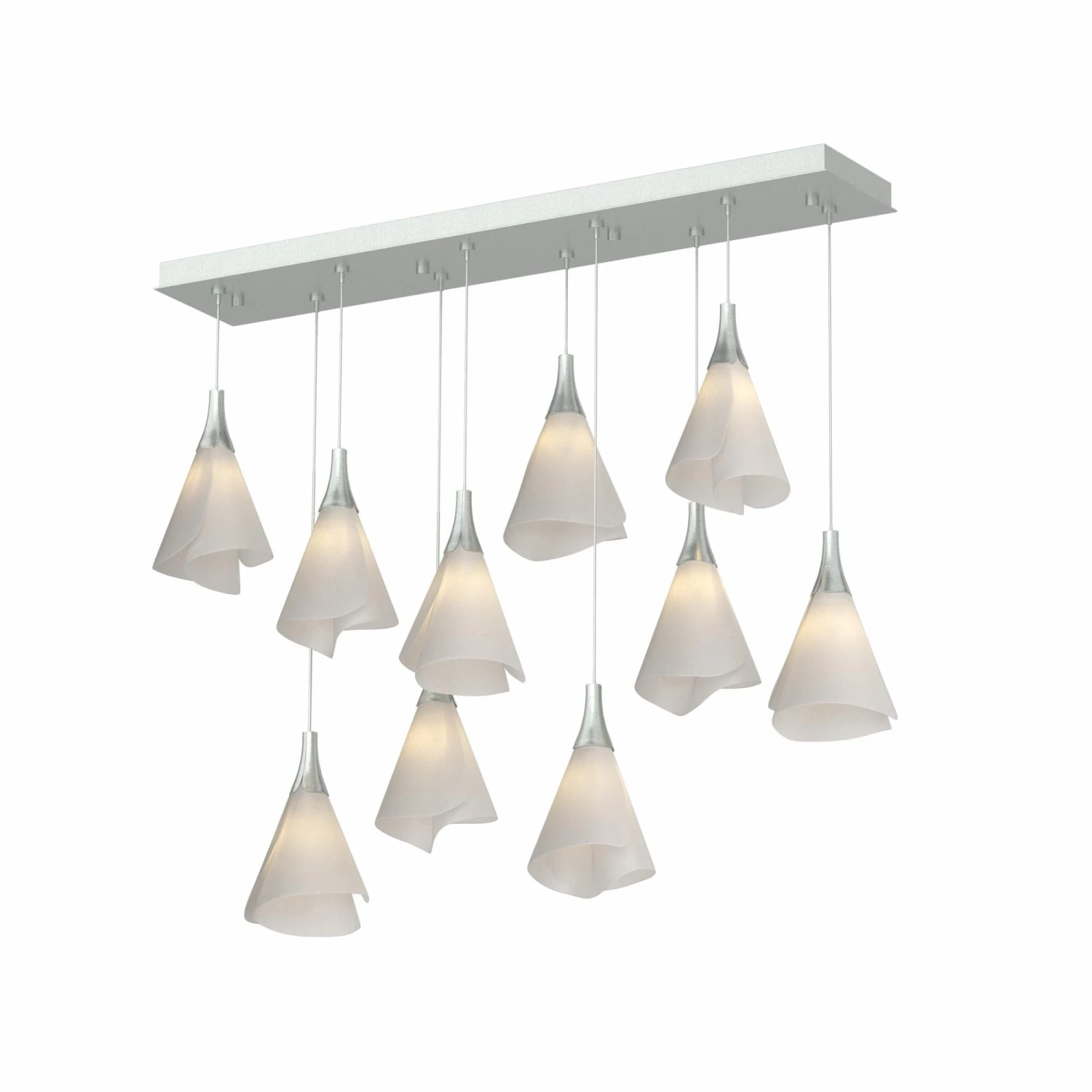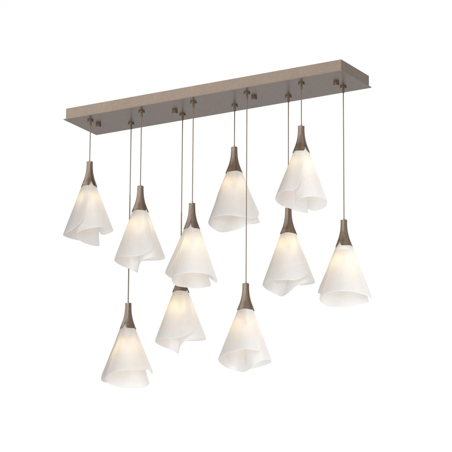 Graceful Mobius spun-frost shades seem to float in space from the rectangular canopy above. With the ability to customize each shade’s positioning, whether you prefer the 10 lights to be aligned or staggered heights, the Mobius 10-Light fixture features a double linear multi-port. All Hubbardton Forge products are hand-crafted to last one at a time in Vermont and backed by a Lifetime Limited Warranty.