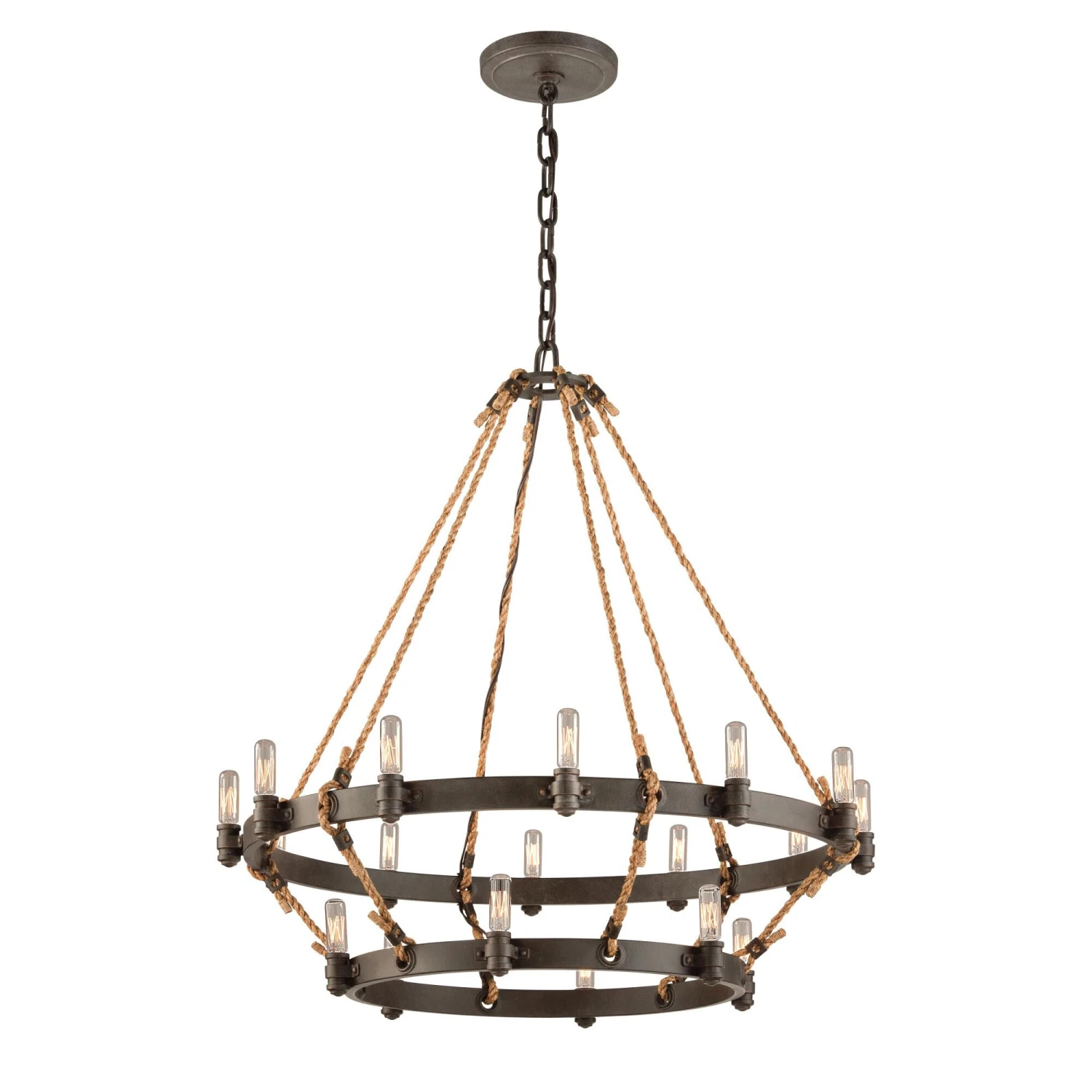 Named for Seattle”s classic seaside market, the Pike Place 18 Light Pendant by Troy Lighting is rustic detailing with a romantic nautical inspiration. This double-tiered candelabra is hand-crafted with wrought iron, finished in shipyard bronze and suspended by natural manila rope. Exposed filament bulbs complete this chic turn-of-the-century centerpiece. The Pike Place will bring homespun antique elegance and a yearning for the sea to your foyer, dining room, or living room.