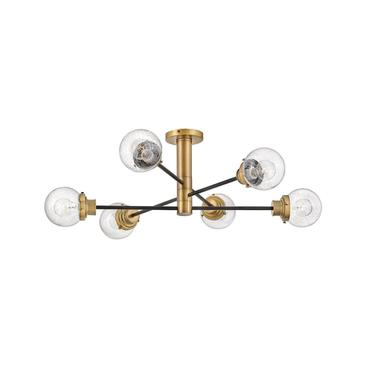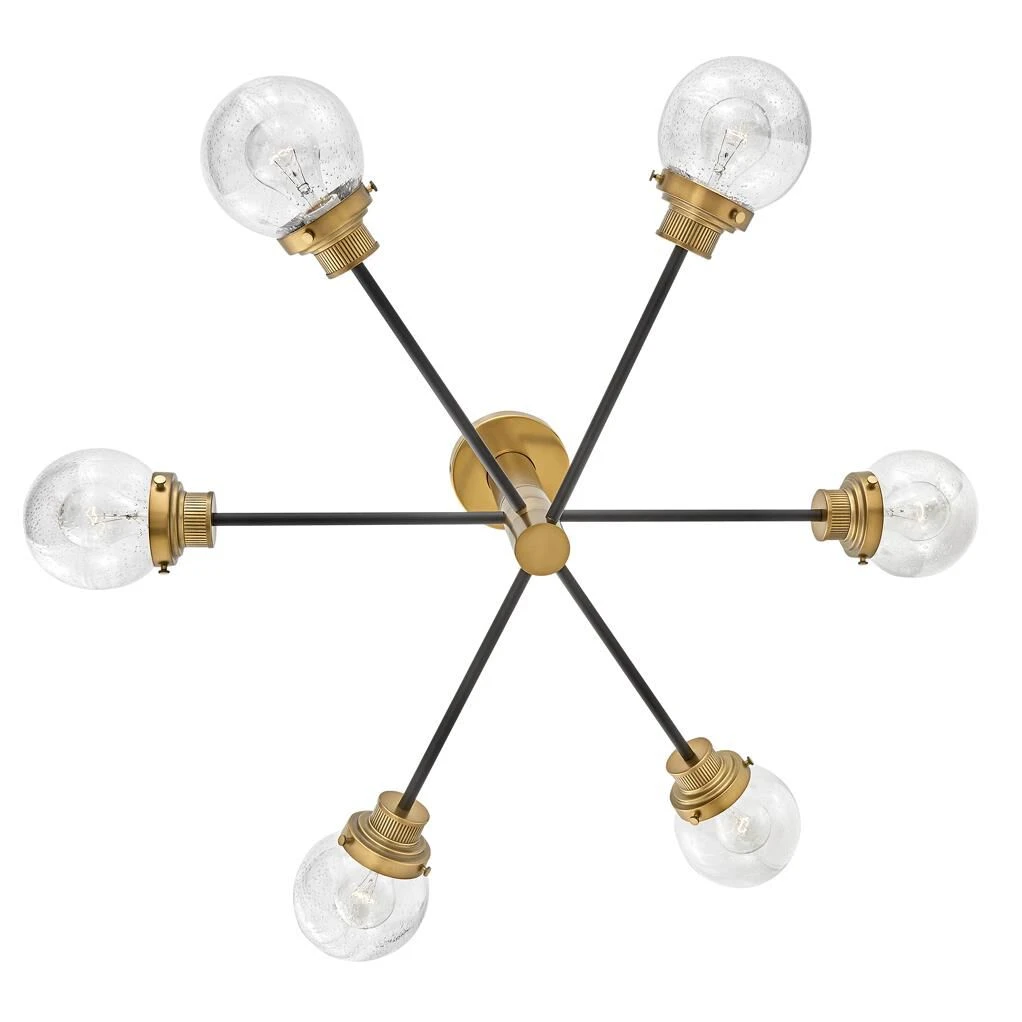 Poppy features clear seedy glass spheres that bubble out of refined, ribbed fitters to create a simple, yet sophisticated silhouette. The dual-finish combinations, Black with Brushed Nickel and Black with Heritage Brass, pair perfectly with a clean backplate or canopy and crisp crossbars to anchor this airy design. Poppy showcases mid-century style with a spectacular spin.