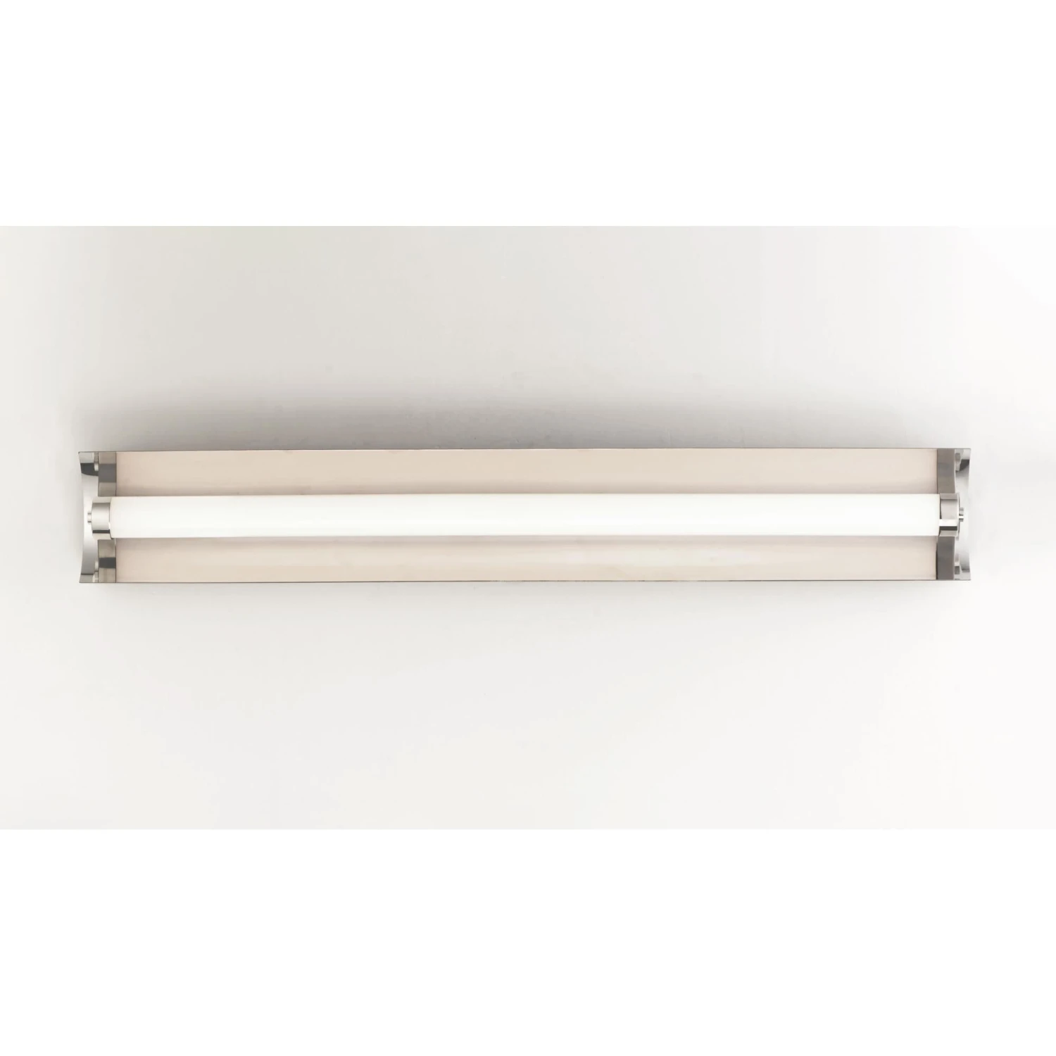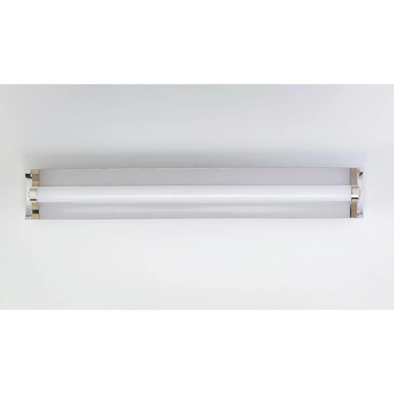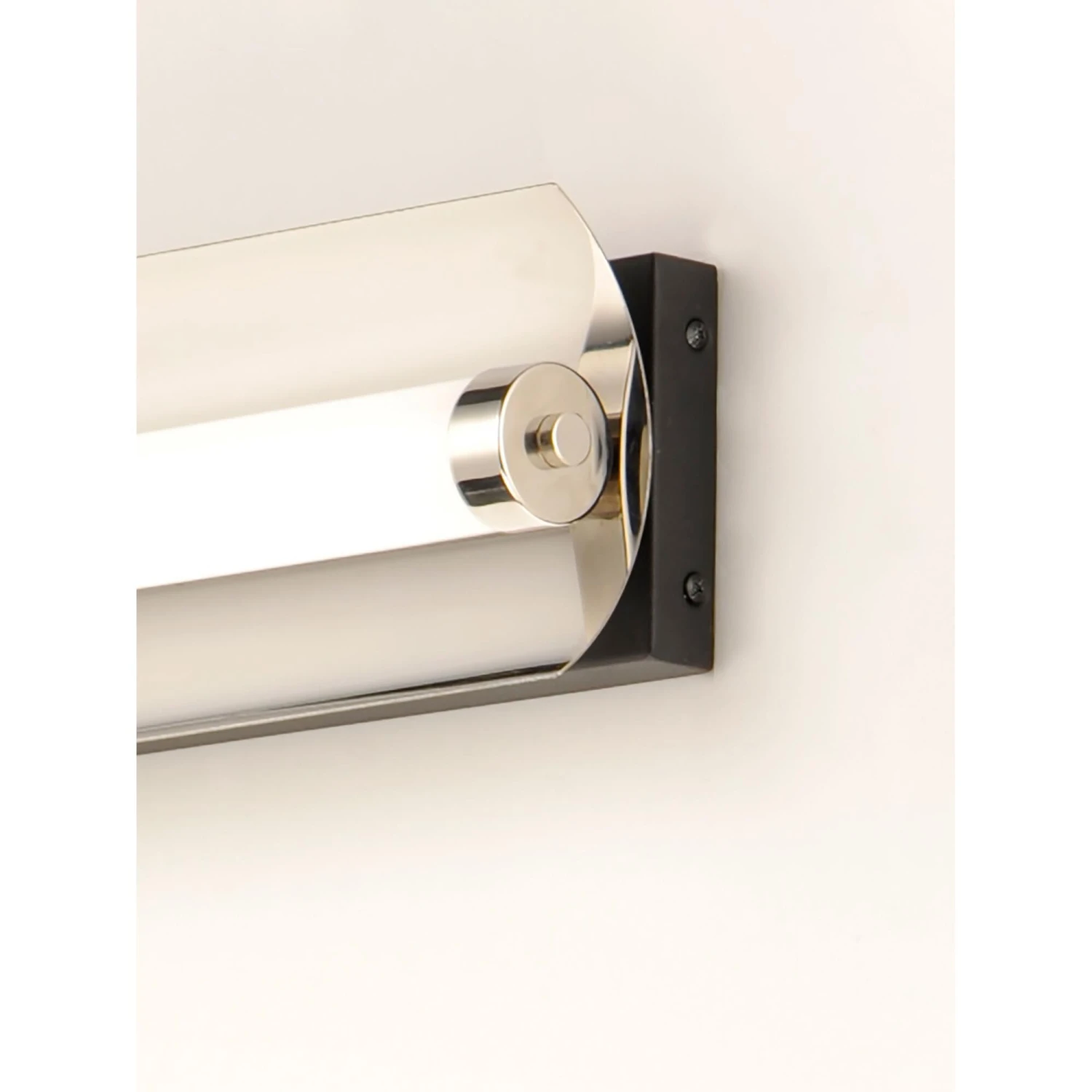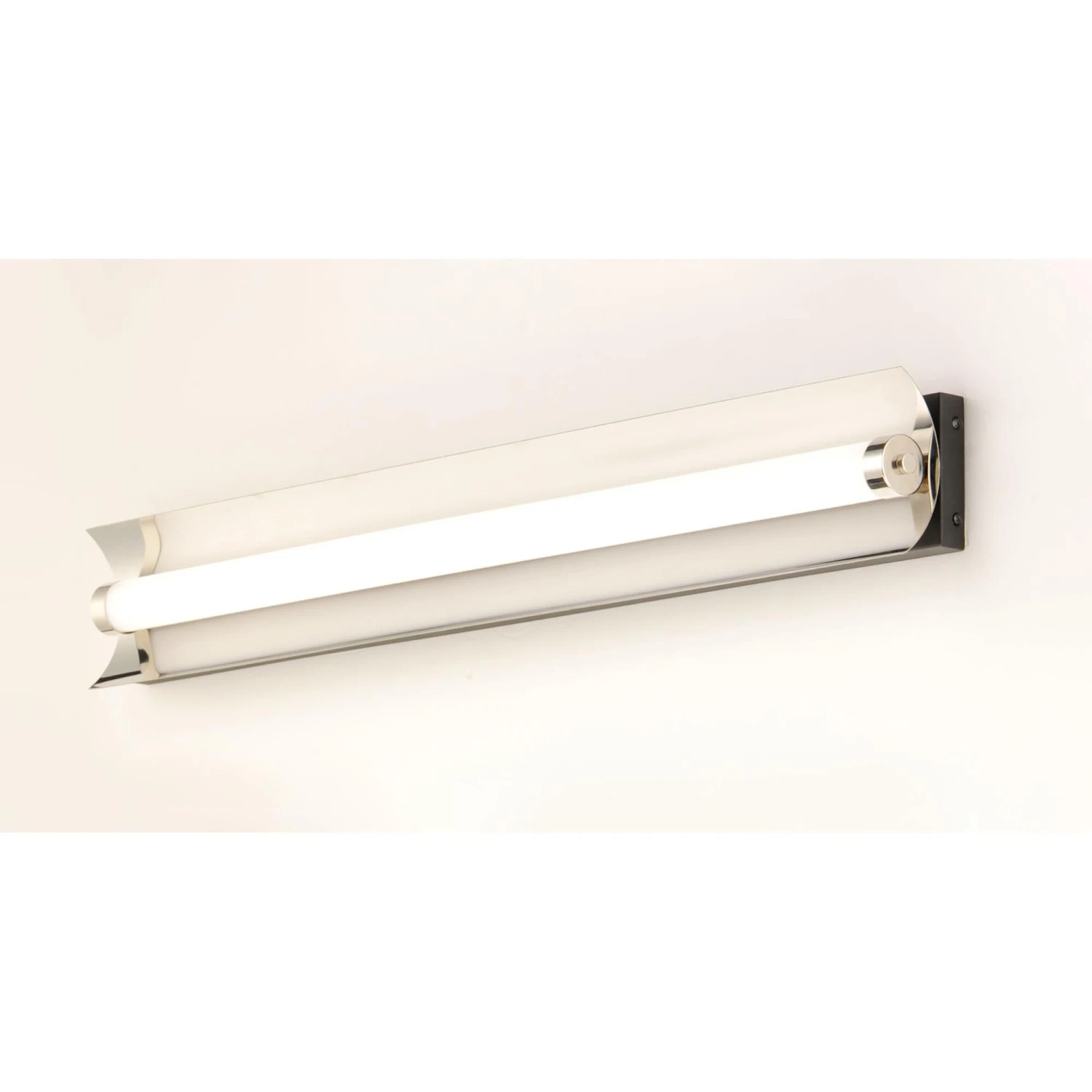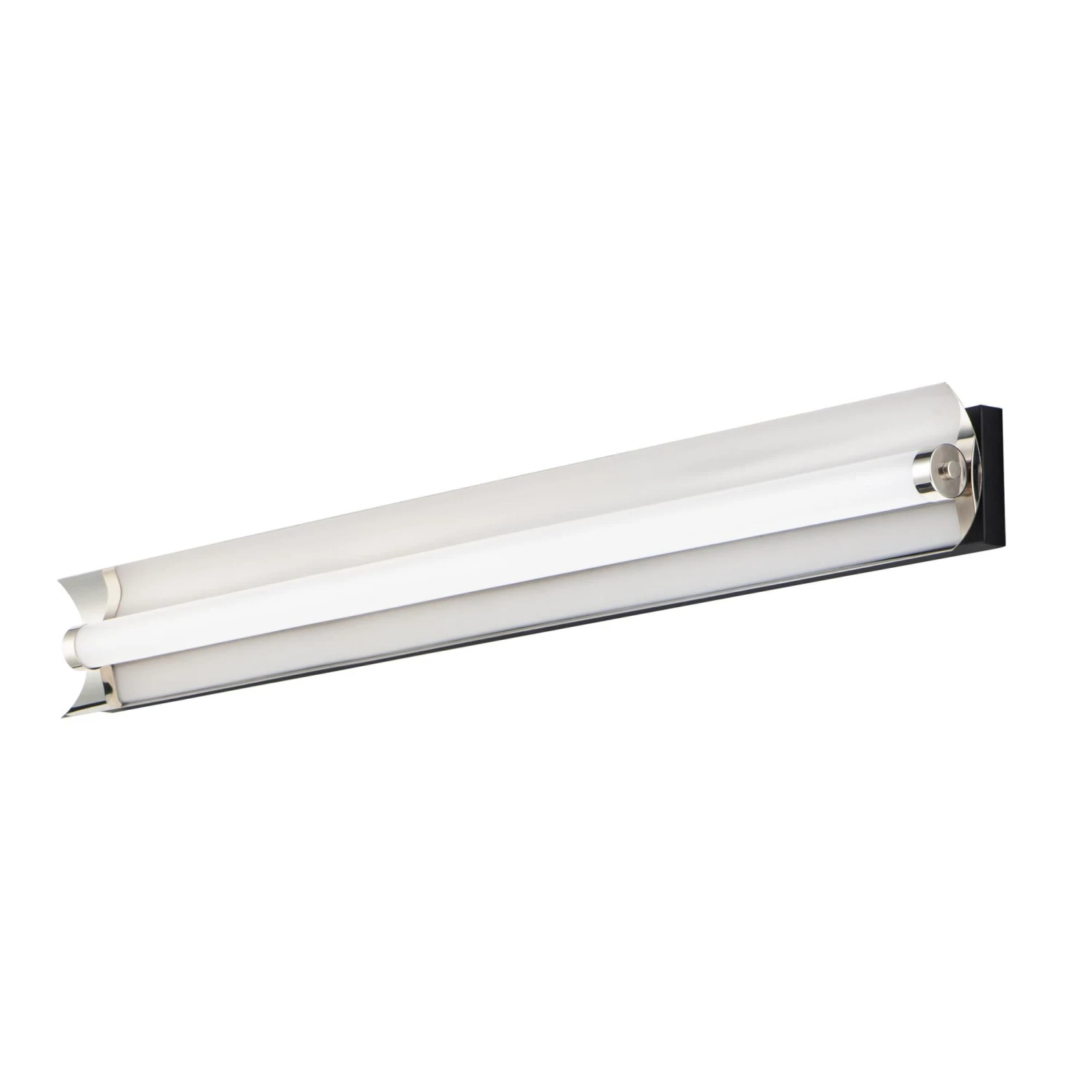A foldable frame of Black support Polished Nickel reflectors behind acrylic tubes which conceal LED modules that project ample light into the room. The bath vanities include our Bluetooth feature that allows for change in color temperature as well as dim ability.