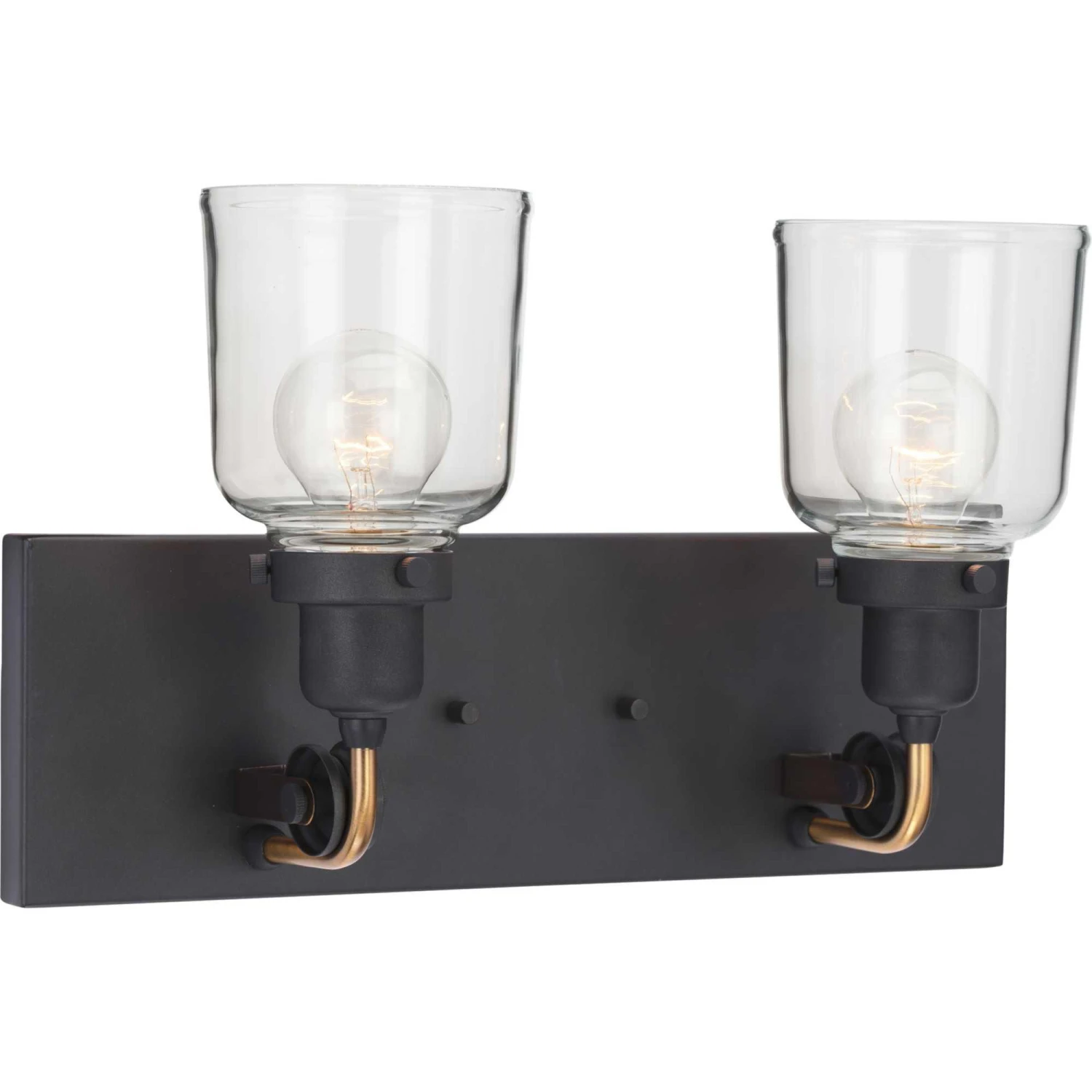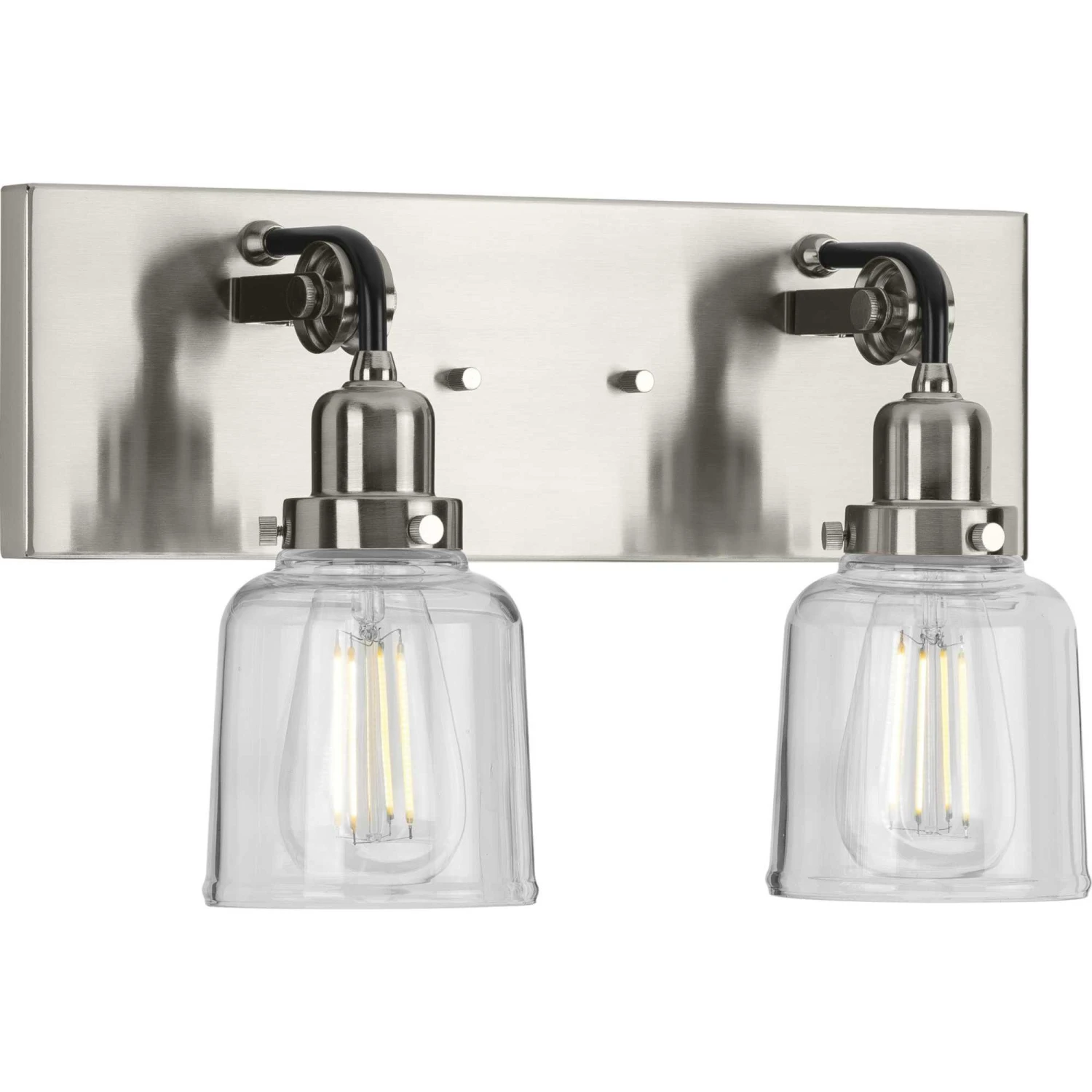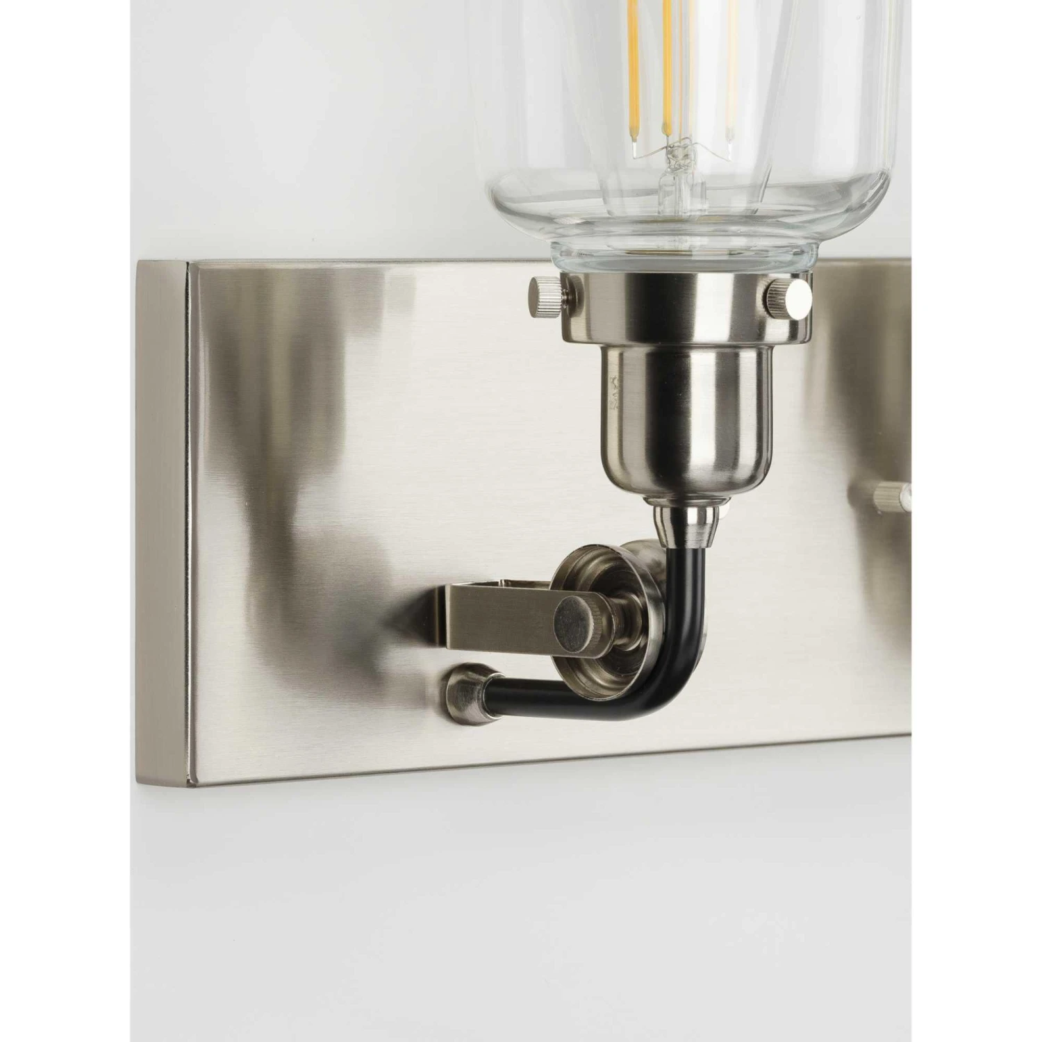Honor history with the Rushton two-light bath. Two exposed bulbs dressed in clear glass shades make a striking couple as they gracefully hang from antique-style sockets. A square, Brushed Nickel backplate anchors Black tube arms extending over mechanical pulley wheels, bringing history to life as this quintessential piece serves as a bath vanity or wall sconce wherever antique lighting is desired in industrial and farmhouse settings.