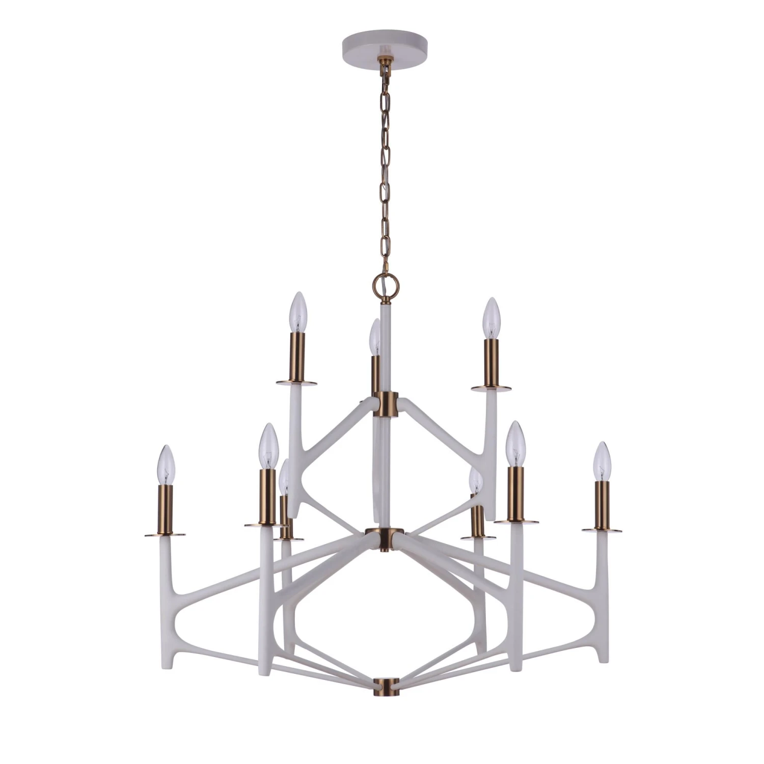 Symmetrical arches in a rich flat black or matte white finish accented with warm satin brass details create The Reserve collection that delivers impressive style . This stately collection includes a single tiered four, six and ten light chandelier, two-tiered nine light chandelier, two light wall sconce and ten light island fixture. The Reserve is damp rated for indoor or covered outdoor use.