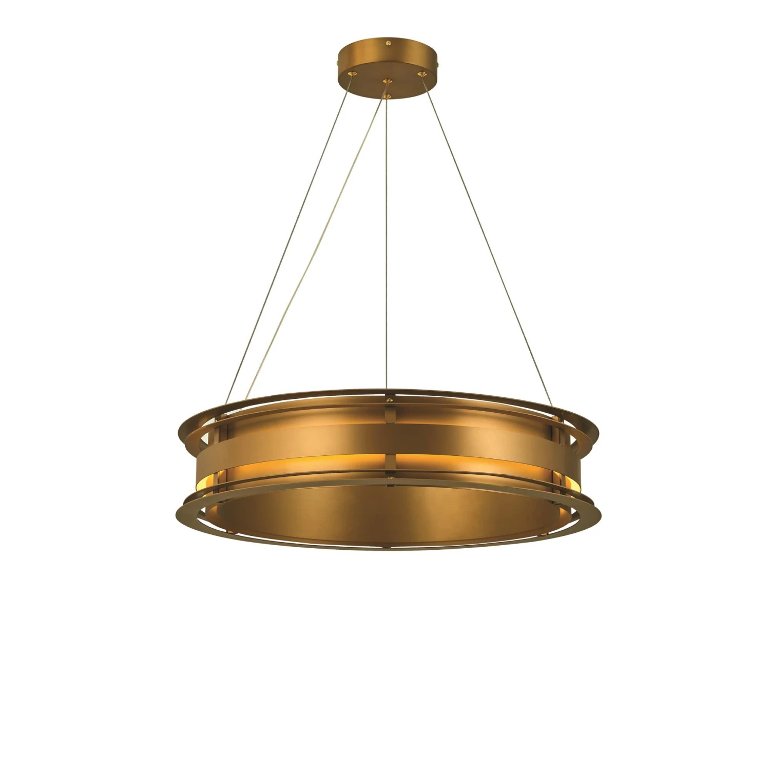 Bristol collection in Antique Gold conceals the lights with metal bands. 30W integrated LED 3000K 80+ Cri 2700 Lumens. Adjustable heights upon installation dimmable with Triac dimmers. 5 year warranty.