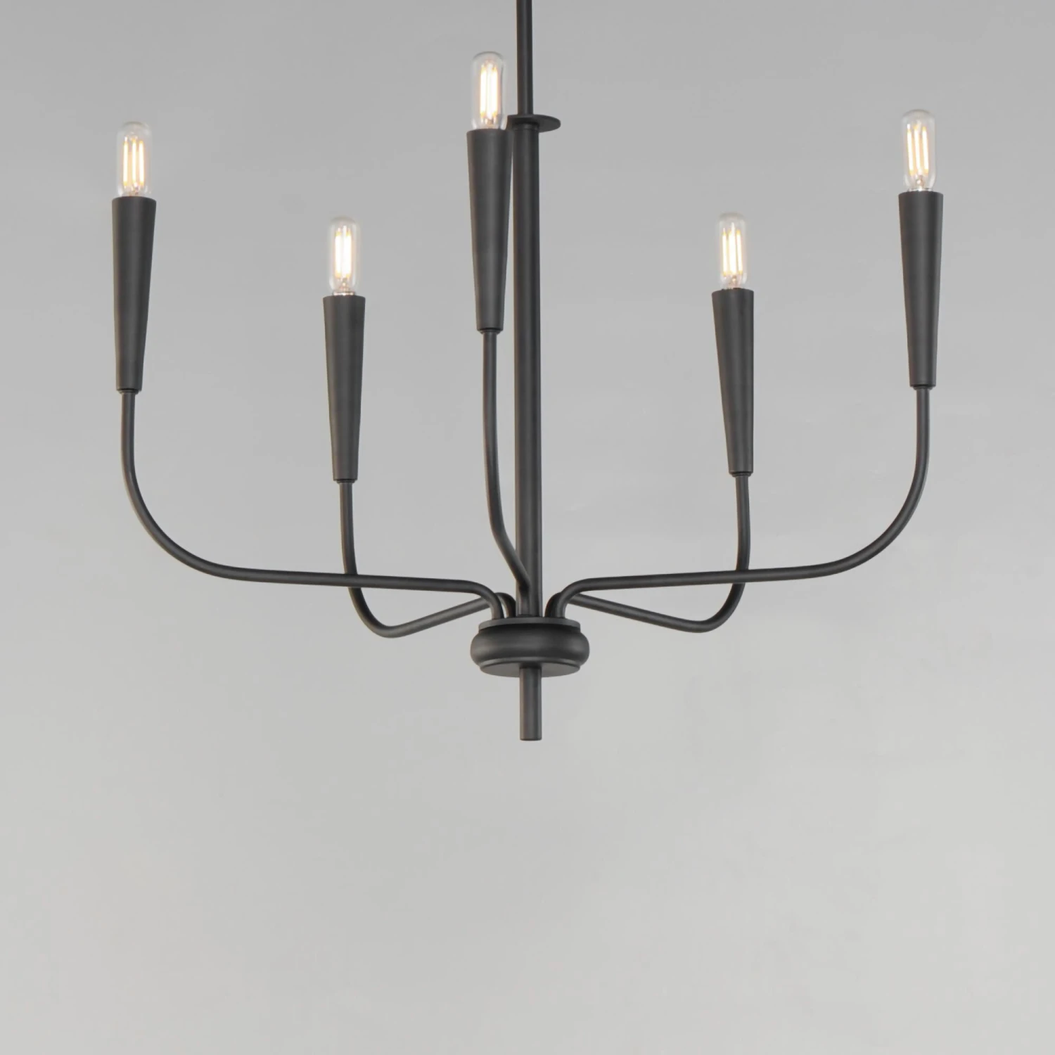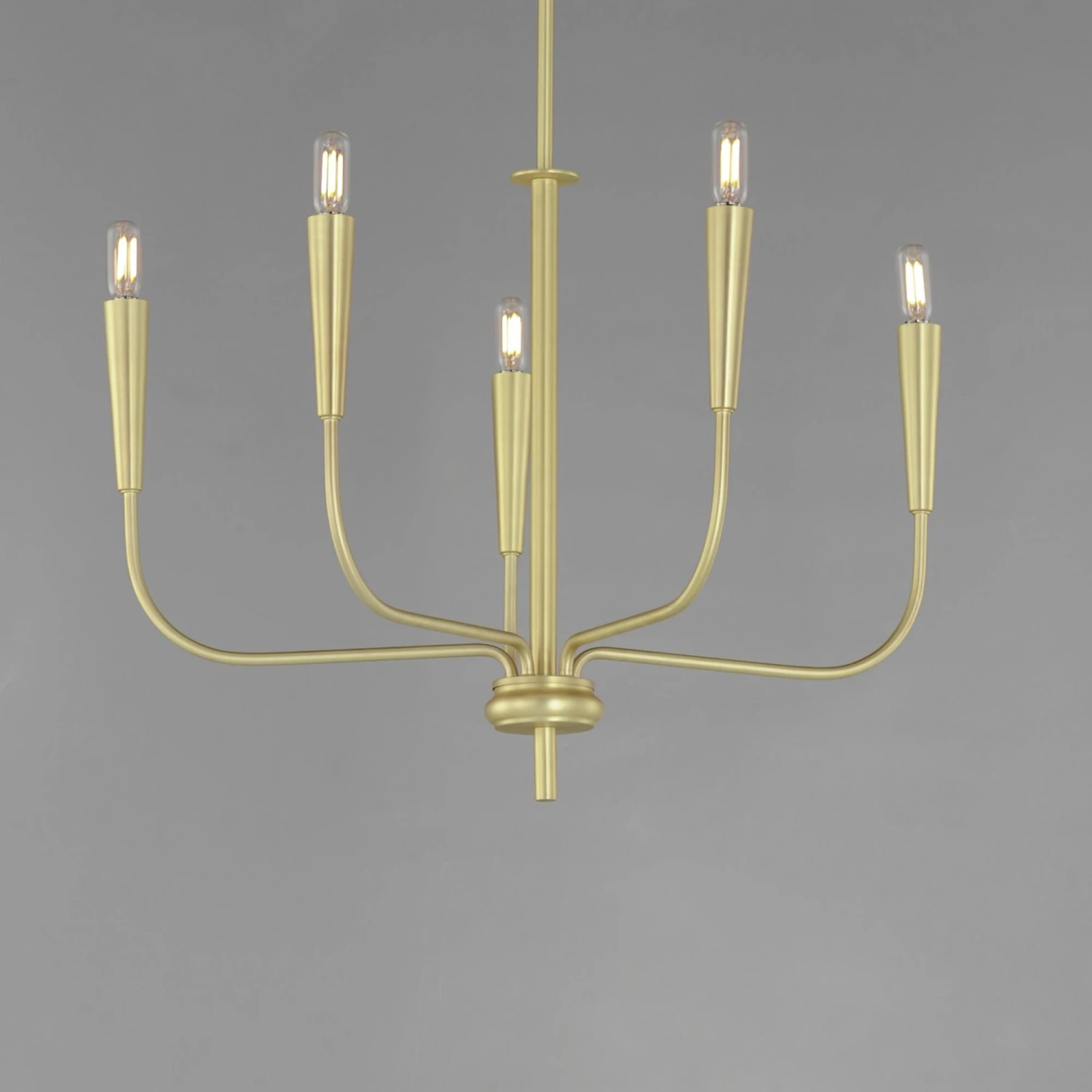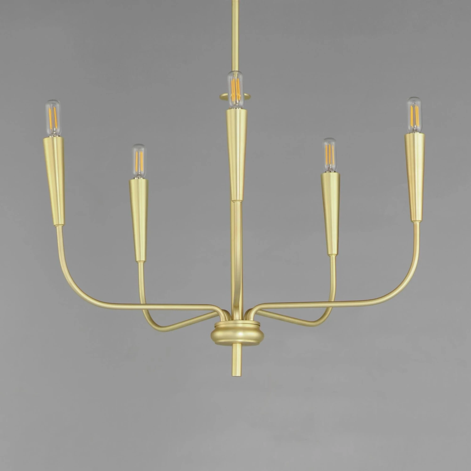 A simple candle style chandelier is given a modern edge with tall tapered candle covers that sit at the ends of curved arms without a bobeche beneath them. Available in Satin Brass or Matte Black, the collection compliments many architectural interiors and allows for creative styling through the selection of lamp type. Pair with our T6 lamp for more modern, industrial flair or classic candelabra for a clean, transitional look. This series provides a convenient new take on the candle chandelier with subtle and unique design details.