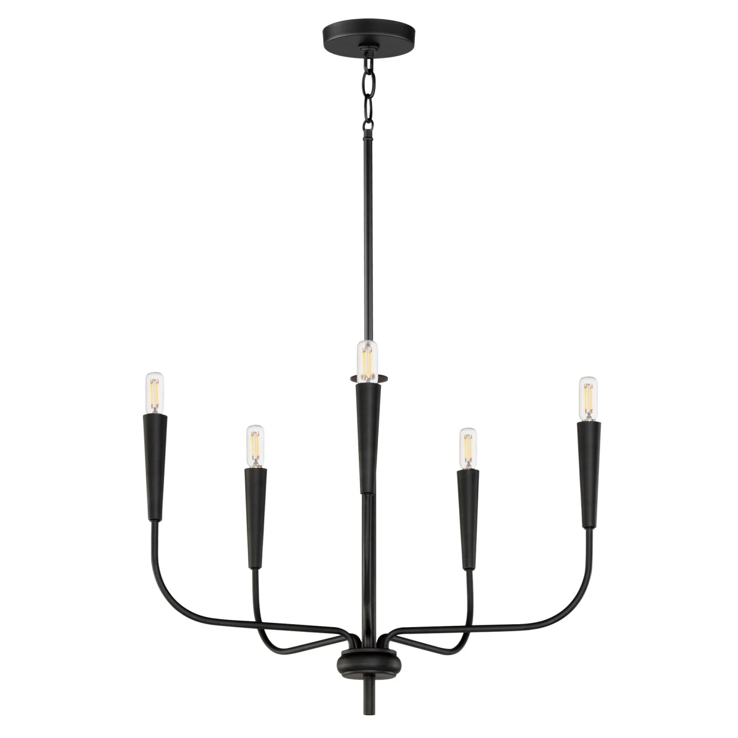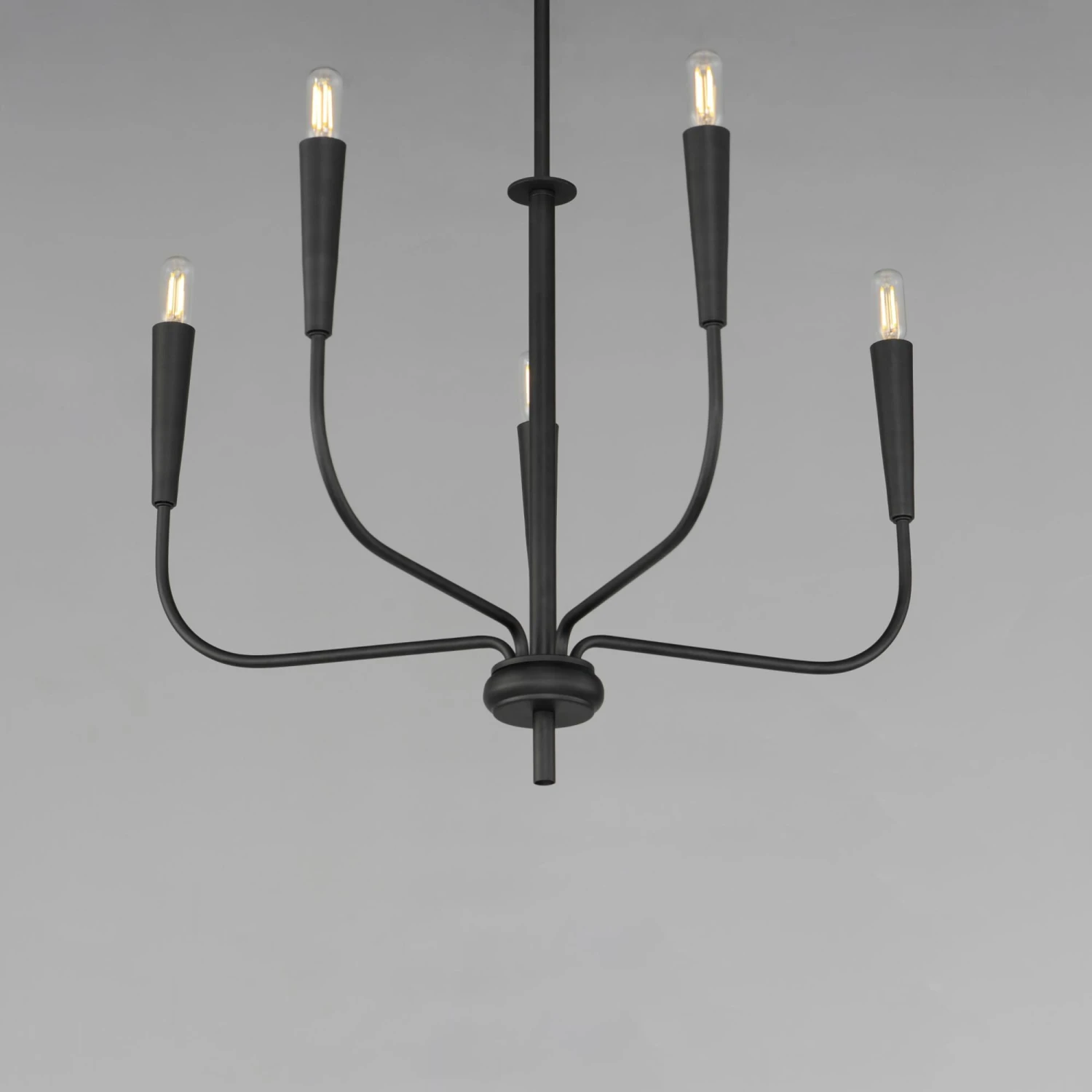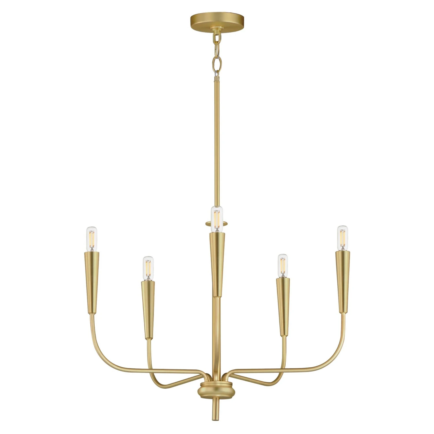 A simple candle style chandelier is given a modern edge with tall tapered candle covers that sit at the ends of curved arms without a bobeche beneath them. Available in Satin Brass or Matte Black, the collection compliments many architectural interiors and allows for creative styling through the selection of lamp type. Pair with our T6 lamp for more modern, industrial flair or classic candelabra for a clean, transitional look. This series provides a convenient new take on the candle chandelier with subtle and unique design details.
