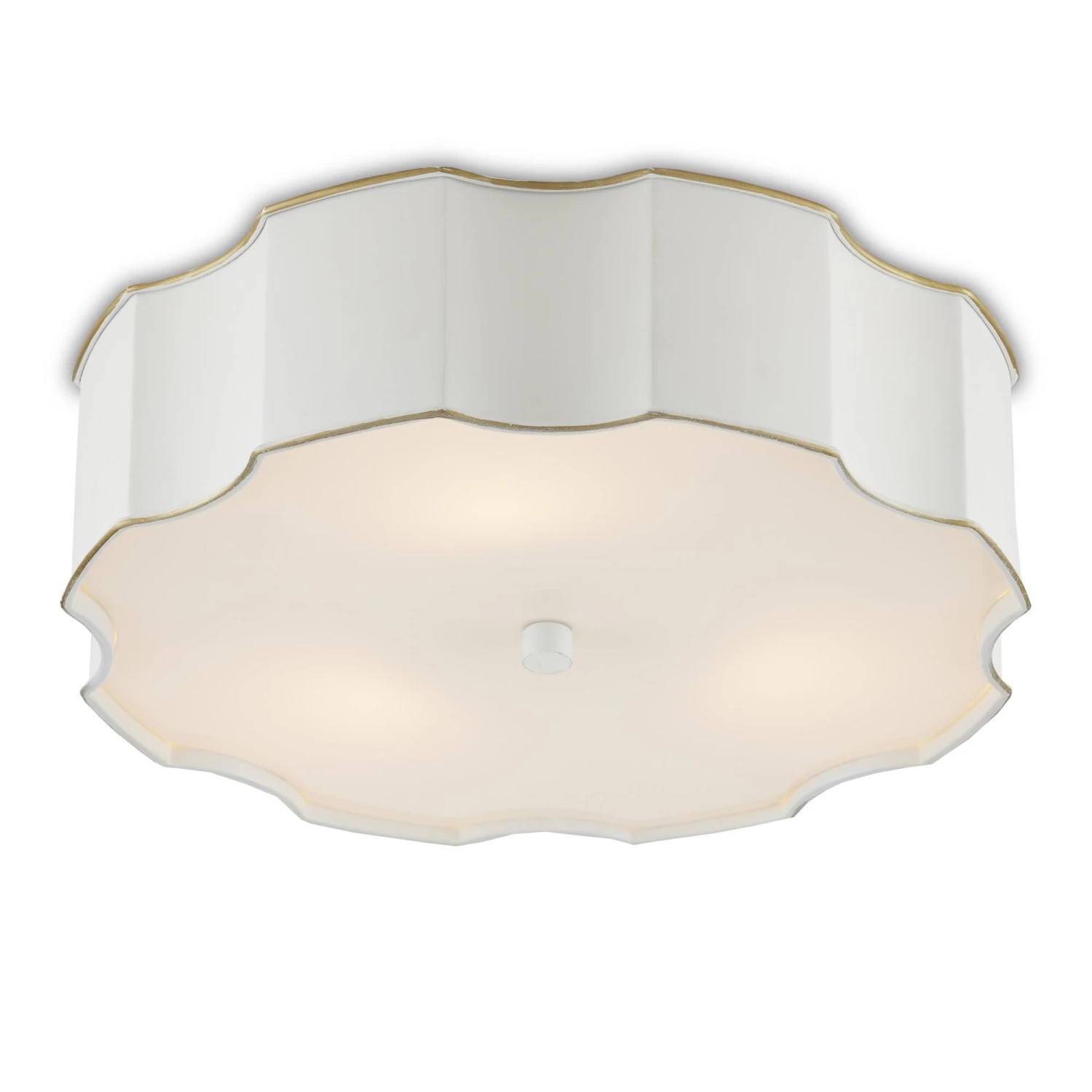 The Wexford White Flush Mount is made of metal in a snow white finish. The paleness of the surface works in concert with the soft glow produced by the opaque acrylic diffuser to create a luminous design envisioned by Tom Caldwell. The matching finial that fastens the diffuser to the fixture and the scalloped shape of its profile are graceful elements.
